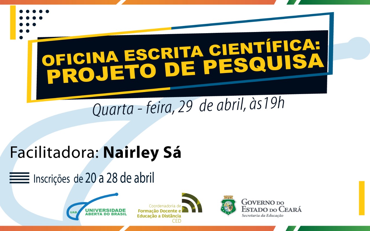A Coordenadoria de Formação Docente e Educação a Distância (Coded/CED) e o Polo UAB/Coded Sobral realizarão a Oficina de Escrita Científica, de forma virtual, dia 29 de abril, às 19h. As atividades serão disponibilizadas no ambiente virtual (Avaced).