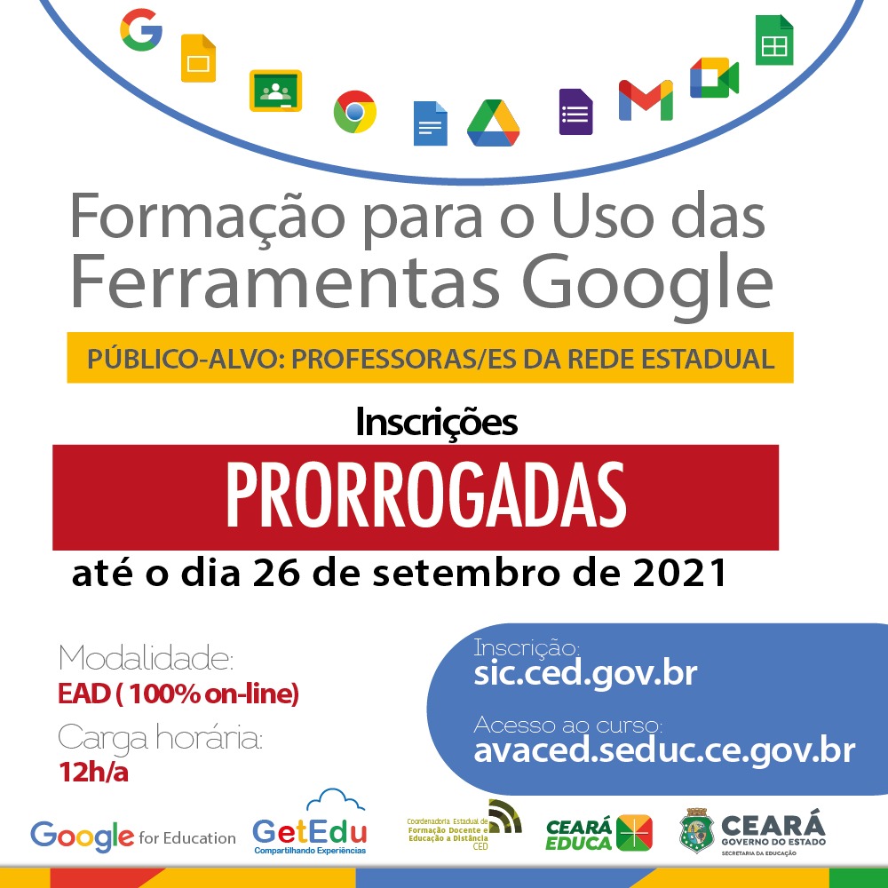 A Secretaria da Educação do Estado do Ceará (Seduc-CE), por meio da Coordenadoria Estadual de Formação Docente e Educação a Distância (Coded/CED), em parceria com o Google for Education e GetEdu, realizará a Formação para o Uso das Ferramentas Google.