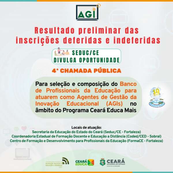 A Secretaria da Educação do Ceará (Seduc) torna público o resultado preliminar das inscrições deferidas e indeferidas da 4ª chamada pública para seleção de profissionais da educação para a composição de banco para atuarem como Agentes de Gestão da Inovação Educacional (AGI), no âmbito do Programa Ceará Educa Mais, o qual subsidiará a ação pedagógica dos/as professores/as, visando a melhoria do processo de ensino e aprendizagem na rede pública estadual do Ceará, na linha de ação Professor Aprendiz.