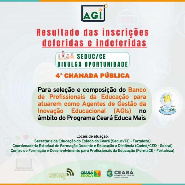 A Secretaria da Educação do Ceará (Seduc) torna público o resultado final das inscrições deferidas e indeferidas da 4ª chamada pública para seleção de profissionais da educação para a composição de banco para atuarem como Agentes de Gestão da Inovação Educacional (AGI), no âmbito do Programa Ceará Educa Mais, o qual subsidiará a ação pedagógica dos/as professores/as, visando a melhoria do processo de ensino e aprendizagem na rede pública estadual do Ceará, na linha de ação Professor Aprendiz.