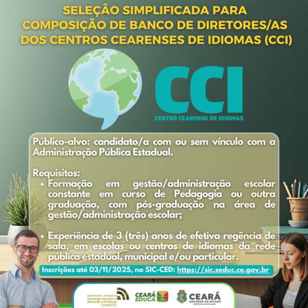 A Secretaria da Educação do Ceará (Seduc/CE) está com inscrições abertas para a seleção de gestores/as dos Centros Cearenses de Idiomas (CCI).