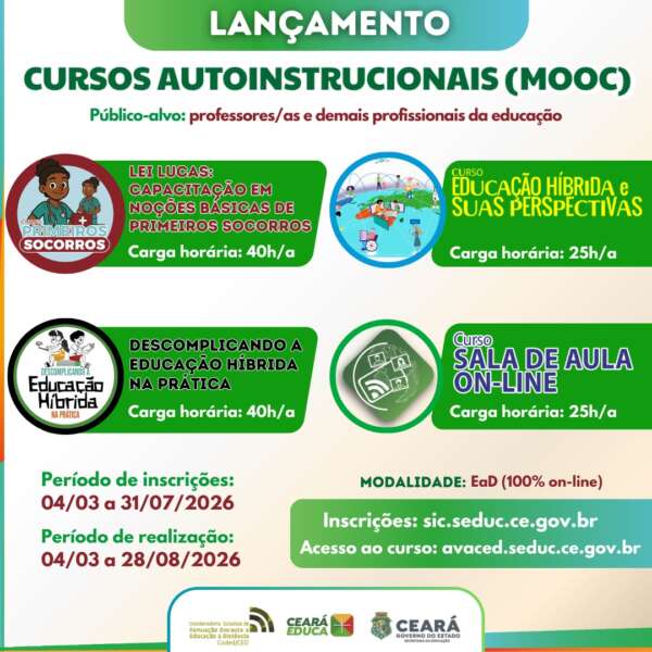A Secretaria da Educação do Ceará (Seduc/CE), por meio da Coordenadoria Estadual de Formação Docente e Educação a Distância (Coded/CED) lança, nesta quarta-feira, dia 4, a 1ª oferta de cursos autoinstrucionais para professores e demais profissionais da educação, na modalidade Massive Open On-line Course (Mooc), disponíveis no Ambiente Virtual de Aprendizagem (Avaced). As inscrições se estenderão até o dia 31 de julho e a realização até 28 de agosto de 2026.