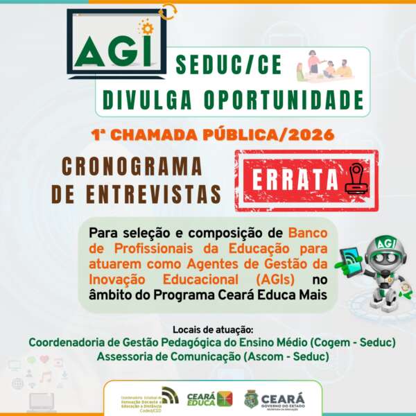 A Secretaria da Educação do Estado do Ceará (Seduc), por meio desta errata, torna públicas as modificações referentes à divulgação do CRONOGRAMA DE ENTREVISTAS da Chamada Pública para Seleção e Composição de Banco de Profissionais da Educação para atuarem como Agentes de Gestão da Inovação Educacional (AGI) na Coordenadoria de Gestão Pedagógica do Ensino Médio (COGEM) OU na Assessoria de Comunicação (ASCOM), publicado no site da Seduc em 20 de março de 2026.