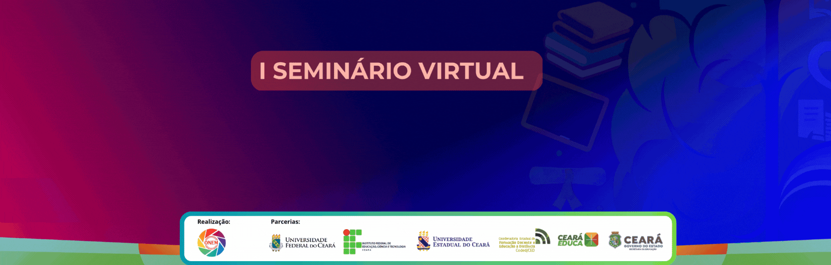 A Secretaria da Educação do Ceará (Seduc/CE), em parceria com o Grupo de Pesquisa Observatório do Novo Ensino Médio (Onem), Universidade Federal do Ceará (UFC), Instituto Federal de Educação, Ciência e Tecnologia do Ceará (IFCE) e Universidade Estadual do Ceará (Uece), por meio da Coordenadoria Estadual de Formação Docente e Educação a Distância (Coded/CED), promove o I Seminário Virtual – Novo Ensino Médio e a saúde do professor.